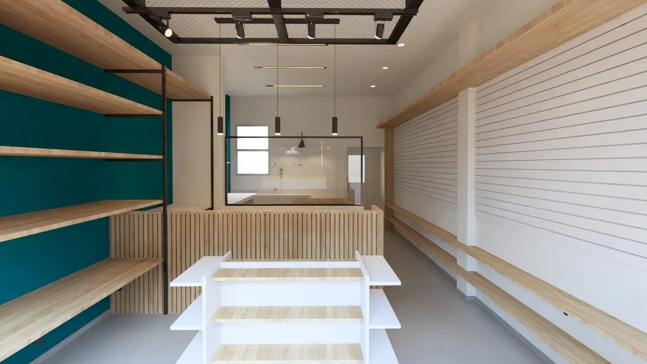 Paneros, revestimiento, mueble de caja y bancos enchapados en paraíso y laqueados en poliuretano transparente.